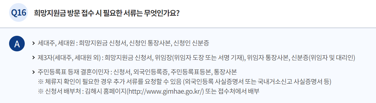 희망지원금 Q&A 내용을 보면 희망지원금 신청서의 배부처는 김해시 홈페이지 또는 접수처에서 배부한다고 되어 있습니다.