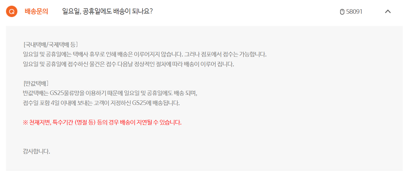 2. GS25 편의점 반값택배 토,일요일도 배송하나요?