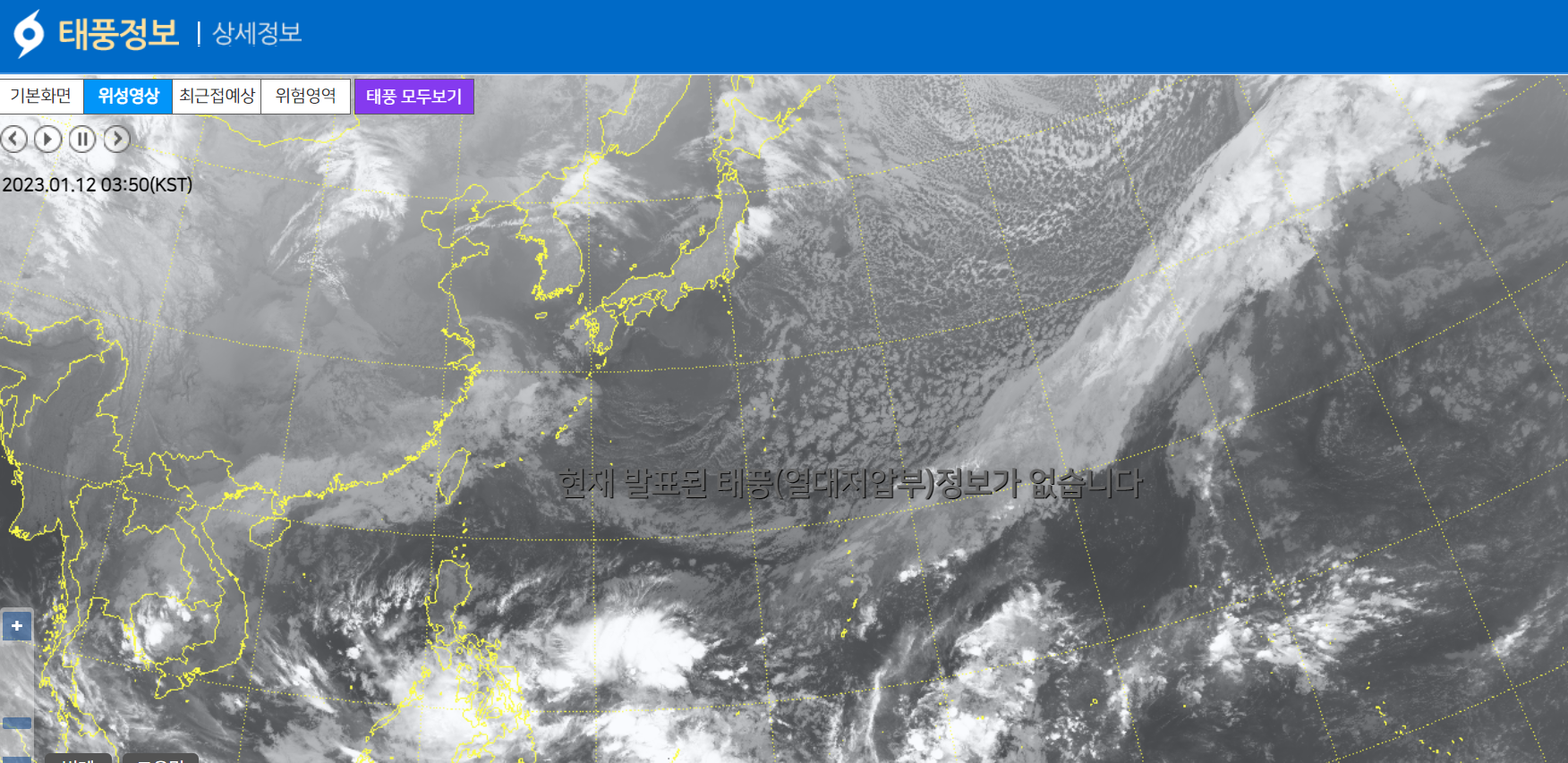 현재는 태풍의 정보가 없으나, 태풍이 발생하게 되면 날씨우리를 통해 태풍의 위치를 한눈에 파악하실 수 있습니다.