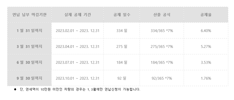 앞서 소개해드린 1월뿐만 아니라, 3,6,9월에도 연납신청하여 납부를 하실 수 있지만, 표에서 보실 수 있듯이 연납 세액할인율자체가 달라지기 때문에 금전적 여유가 있다면 웬만하면 1월달에 납부하시는 것이 가장 큰 절세혜택을 누릴 수 있습니다.