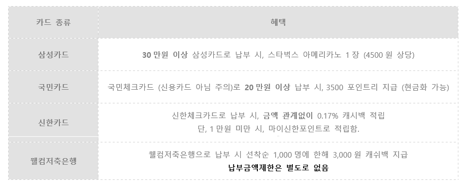 그냥 계좌이체로 현금 납부를 했을 경우에는 정부에서 주는 기본 혜택인 공제만 받게 되는데 반해 카드사를 통해 카드납부를 하게 되었을 경우에는 각 카드사 이벤트에 따라 다양한 상품을 받게 되기도 합니다. 카드로 납부 시 타인명의카드로도 납부가 가능하니 혹시 카드 실적을 걱정하는 분이라면 대리 납부가 가능하다는 점도 꼭 기억하셨으면 좋겠습니다.