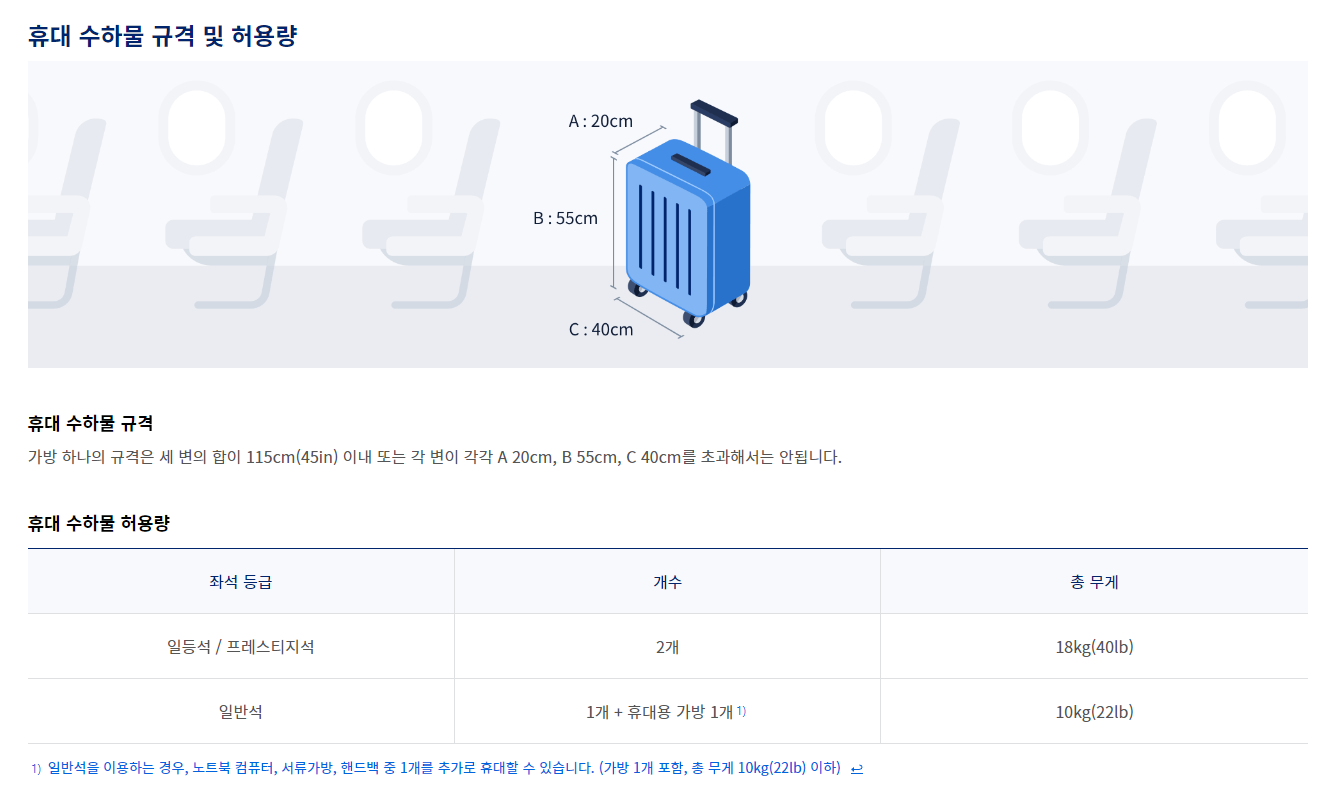 또한, 기내 수화물의 허용량은 좌석 등급에 따라 다르다는 점 또한 알고 계시면 좋을 것 같네요.