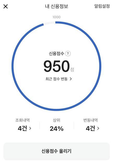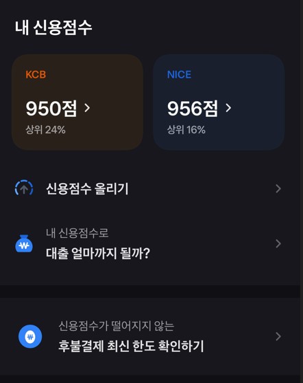 | 조회 방법 | 1. 어플에 로그인 2. 오른쪽 하단 전체선택 (줄 세개) 3. 내 신용점수 선택 4. 필수항목 동의 후 확인 |