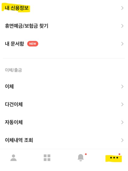 1. 어플에 로그인 2. 오른쪽 하단 점 세개 (...) 3. 메뉴 중 내 신용정보 선택 4. 필수항목 동의 후 확인 |