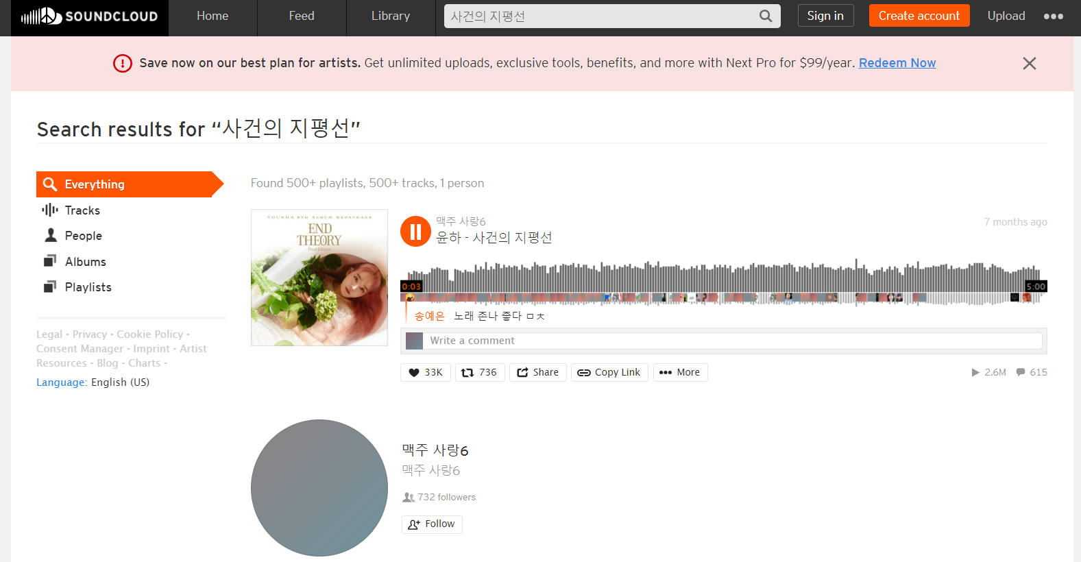 해외 사이트인 사운드 클라우드는 해외 팝송이 주를 이루지만 국내 가요 또한 빠르게 업데이트되어 원하시는 곡을 무리 없이 들으실 수 있습니다. 곡을 검색하고 클릭하면 바로 재생이 되는 구조로 이루어져 있고, 위미박스 대비 조금 더 고음질로 노래를 감상할 수 있다는 장점이 있습니다.