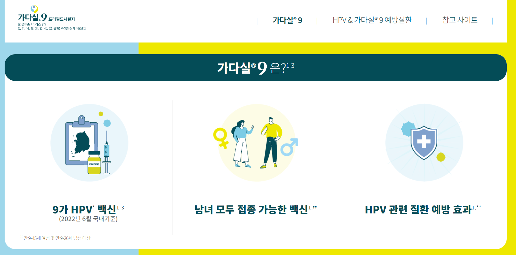 또한, 처음 백신의 권장 나이가 9세부터 26세까지 설정된 나이로 인해 30세가 넘는 여성 및 남성들이 접종을 해야 하는 것인지 헷갈리는 경우가 있는데, 권장 나이를 넘은 경우에도 새로운 타입의 HPV 질병이 발생될 가능성이 있기에 9세에서 45세까지는 남녀불문 맞는 것이 좋습니다.