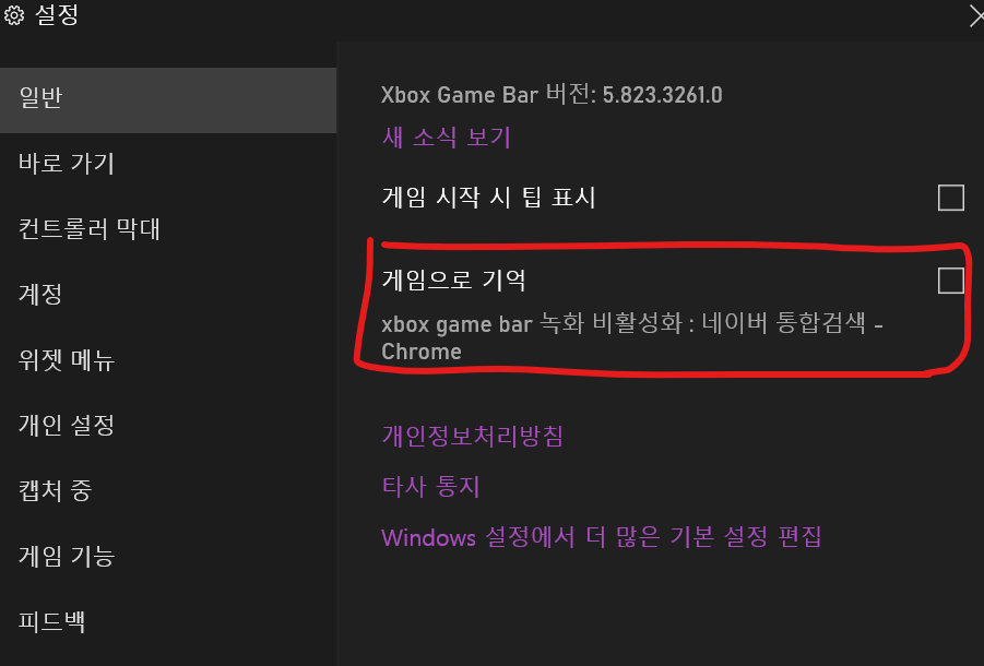 - Xbar game bar 상단 설정 - 일반 - 게임으로 기억 => 바탕화면에서는 게임으로 기억 버튼이 활성화되지 않음.