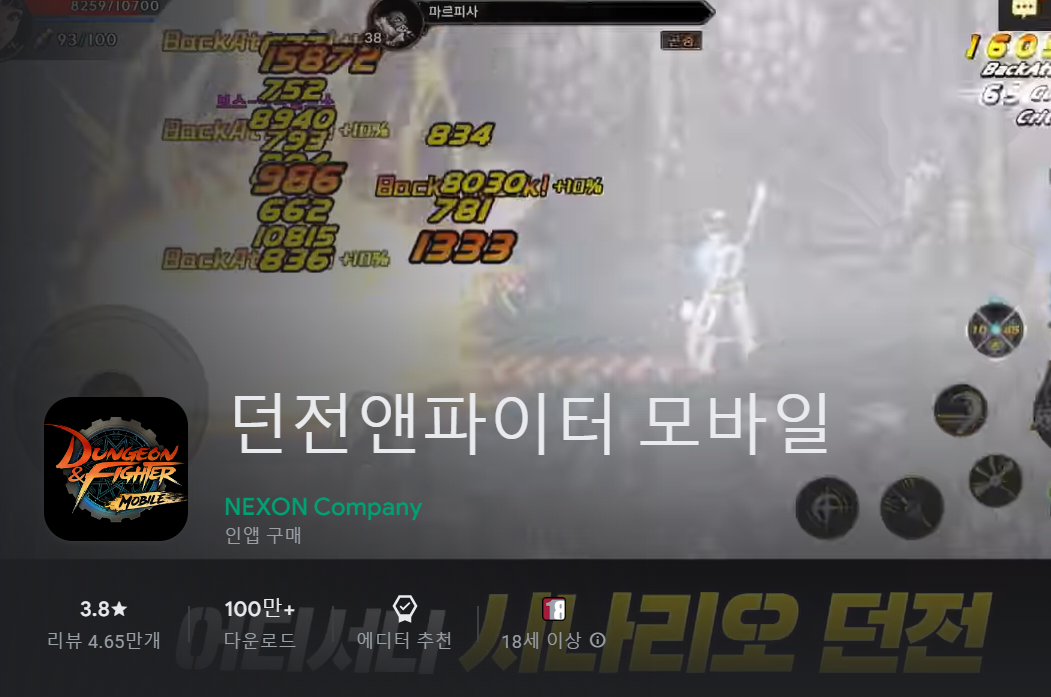 던파 모바일은 PC게임인 던전앤파이터를 그대로 모바일에 이식한 게임인데요. 이전에 PC에서 모바일로 이식한 게임들의 사례와 비추어 본다면 장족의 발전, 가장 성공적으로 이식한 게임이라는 평가를 받고 있습니다. 모바일 전용 터치 조작으로 폰으로도 퀄리티 높은 액션을 즐길 수 있습니다. 현재까지는 과금러와 무과금러의 차이가 그렇게 크지 않으므로 가볍게 즐기시기 나쁘지 않습니다.