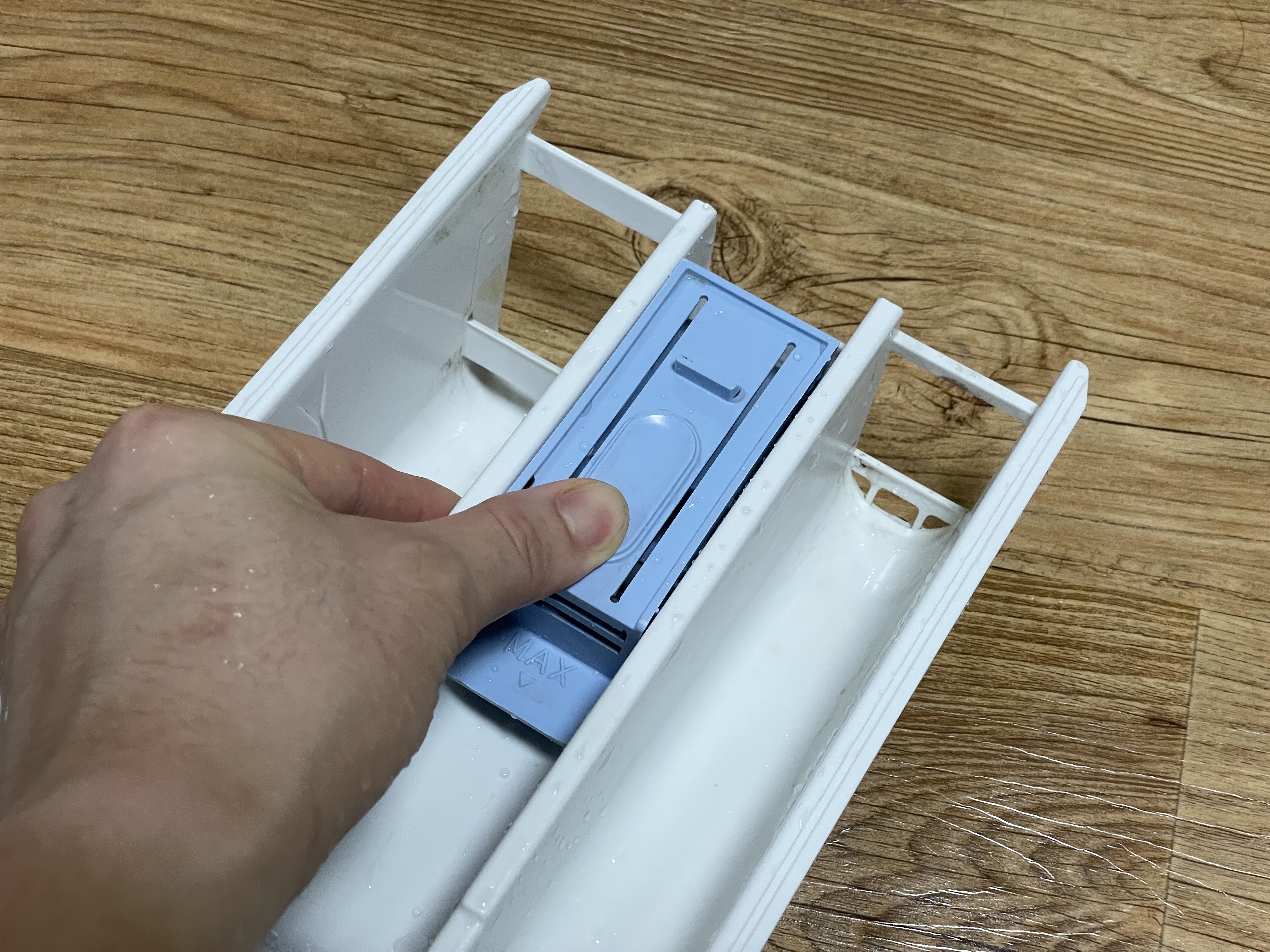 그래서 이 부분을 지그시 누른 상태에서 통을 빼면 아무런 무리 없이 쉽게 세제통을 분리할 수 있습니다. 글로만 설명하면 어려울까 봐 세제통을 분리한 채로도 사진을 찍어봤는데요. 제 엄지손가락 위치가 닿는 저 부분을 누른채로 빼시면 됩니다.