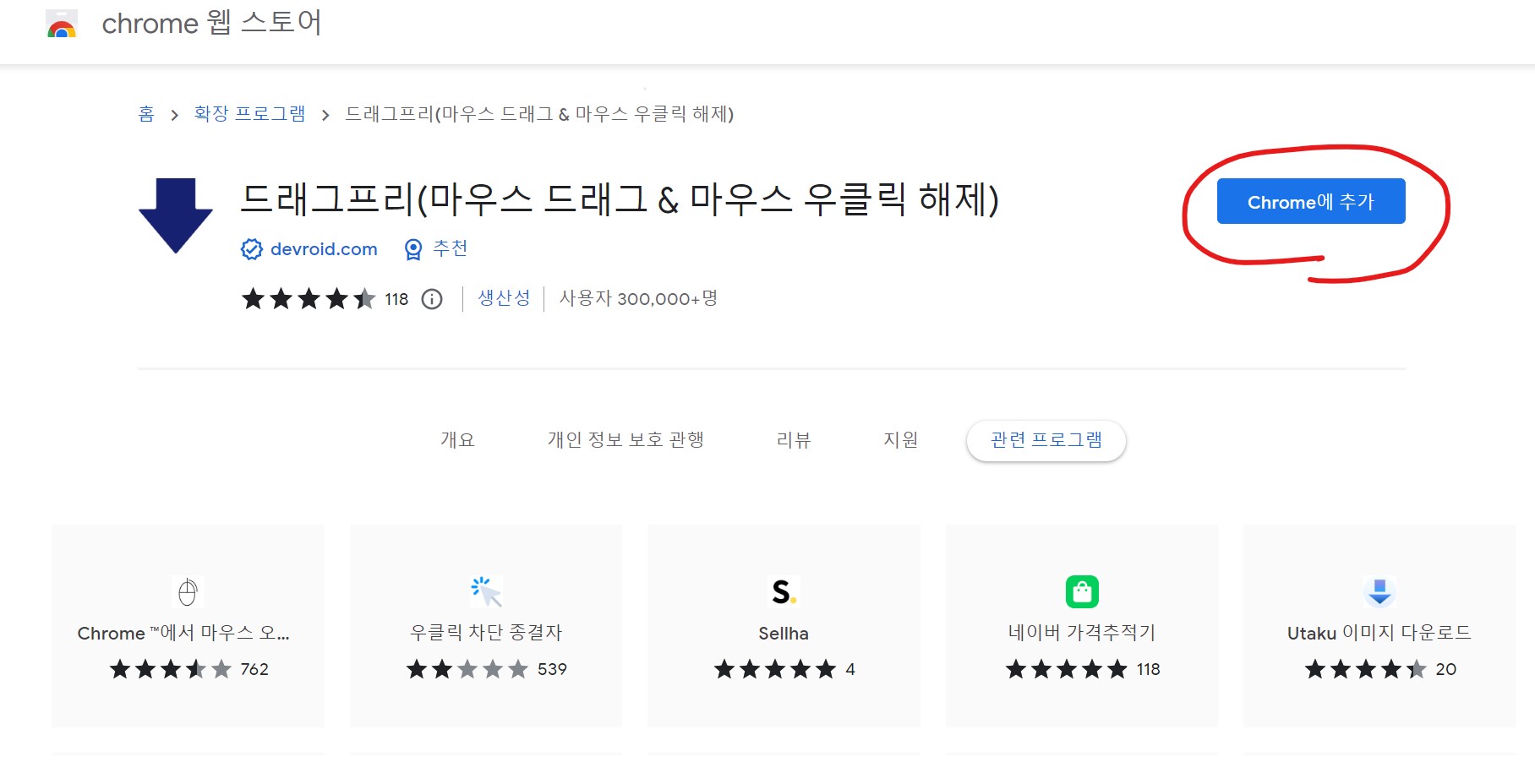 크롬 웹 스토어에 들어가서 드래그 프리 크롬에 추가 버튼을 클릭합니다. 확장프로그램 드래그 프리를 추가하겠냐는 질문에 확장프로그램 추가 버튼을 눌러줍니다.