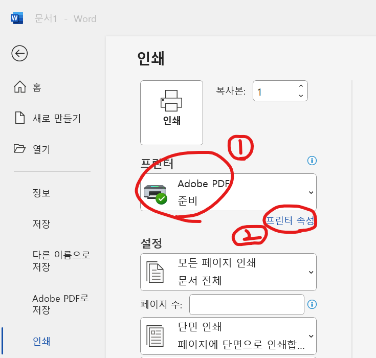오류를 해결하기 위해서는 프린터 속성에서 문서 글꼴 사용 안 함을 체크해주셔야 합니다. 이 설정을 위해서는 일단 변환할 파일을 열어서 Ctrl+P 인쇄 메뉴를 열어줍니다. 여기서 프린터에서 Adobe PDF를 선택합니다.