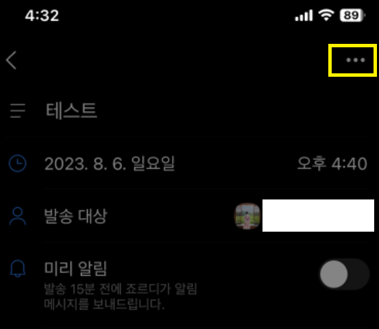예약문자를 취소하는 방법은 예약목록보기, 즉 브리핑보드에서 할 수 있는데요. 브리핑보드에서 해당 메세지를 선택해서 들어간 이후에 우측 상단에 점 3개 (...)를 누르면 예약 메시지 삭제 버튼이 뜹니다.