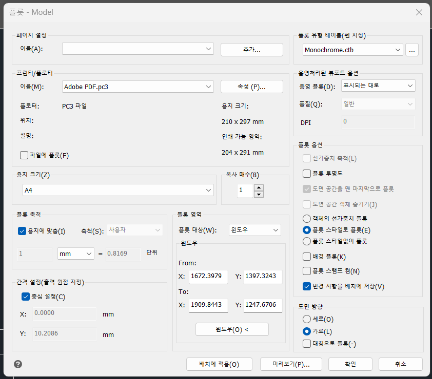 의외로 도면 인쇄방법의 순서는 간단 명료하지만, 인쇄에서 가장 중요한 것은 플롯창에 있는 각종 설정들의 의미를 아는 것입니다.