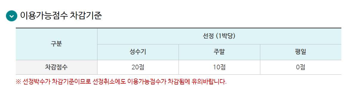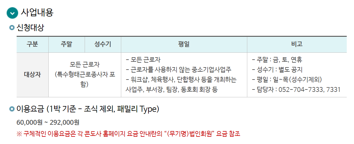 | 이용우선순위 | 1. 근로자 신혼여행의 경우 최우선 선정 2. 이용 가능점수가 높은 근로자 3. 주말.성수기 선정박수가 적은 근로자 4. 나이가 많으 근로자 |