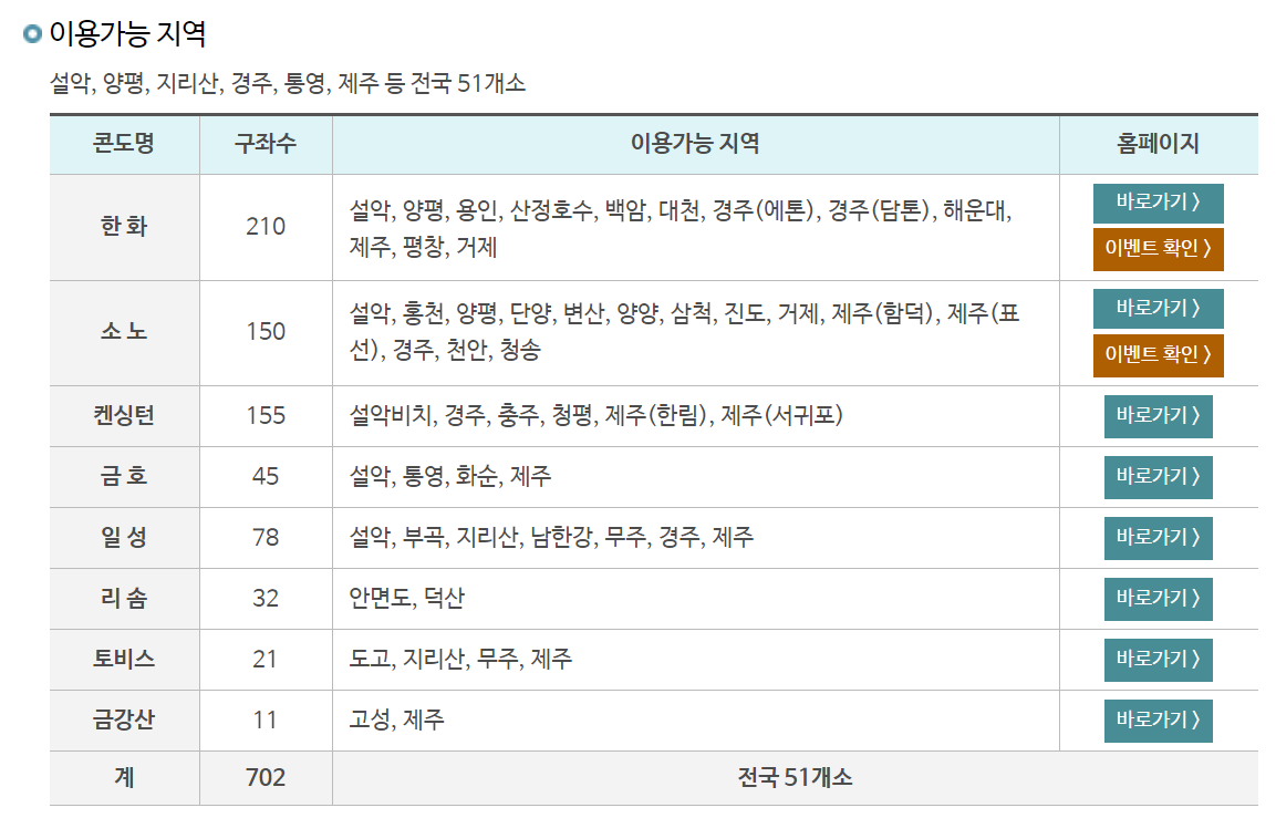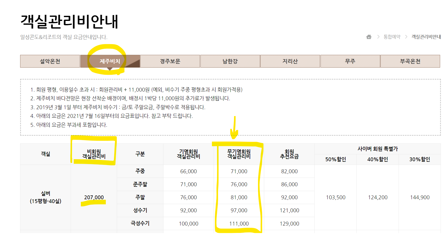 예를 들어 아래 사진의 일성콘도의 경우는 비회원일 때 15평형이 207,000원인데 반해 휴양콘도를 이용하면 극성수기임에도 반값인 111,000원에 이용할 수 있다는 점이 장점입니다.