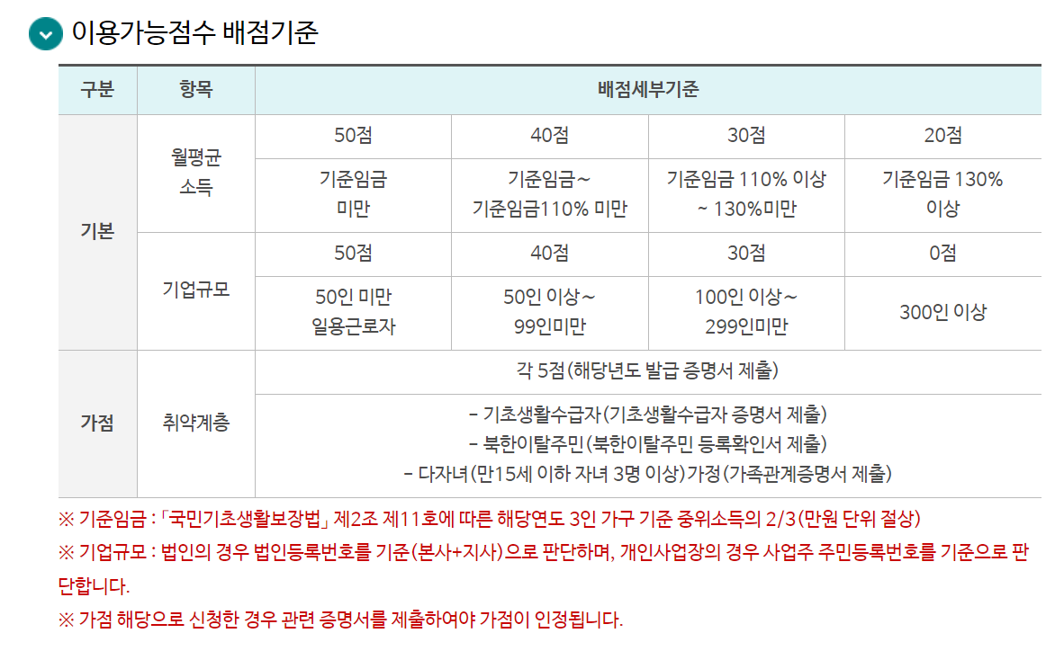 상기 표에서 보시다시피 신혼여행을 제외하고 우선순위는 이용 가능점수가 높은 근로자입니다. 일반적으로 이용 가능점수는 월평균 소득과 기업규모에 따라 정해지고, 취약계층일 경우 가점이 들어갑니다. 이렇게 정해진 이용 가능점수는 휴양콘도를 이용할 때마다 점수가 차감됩니다.