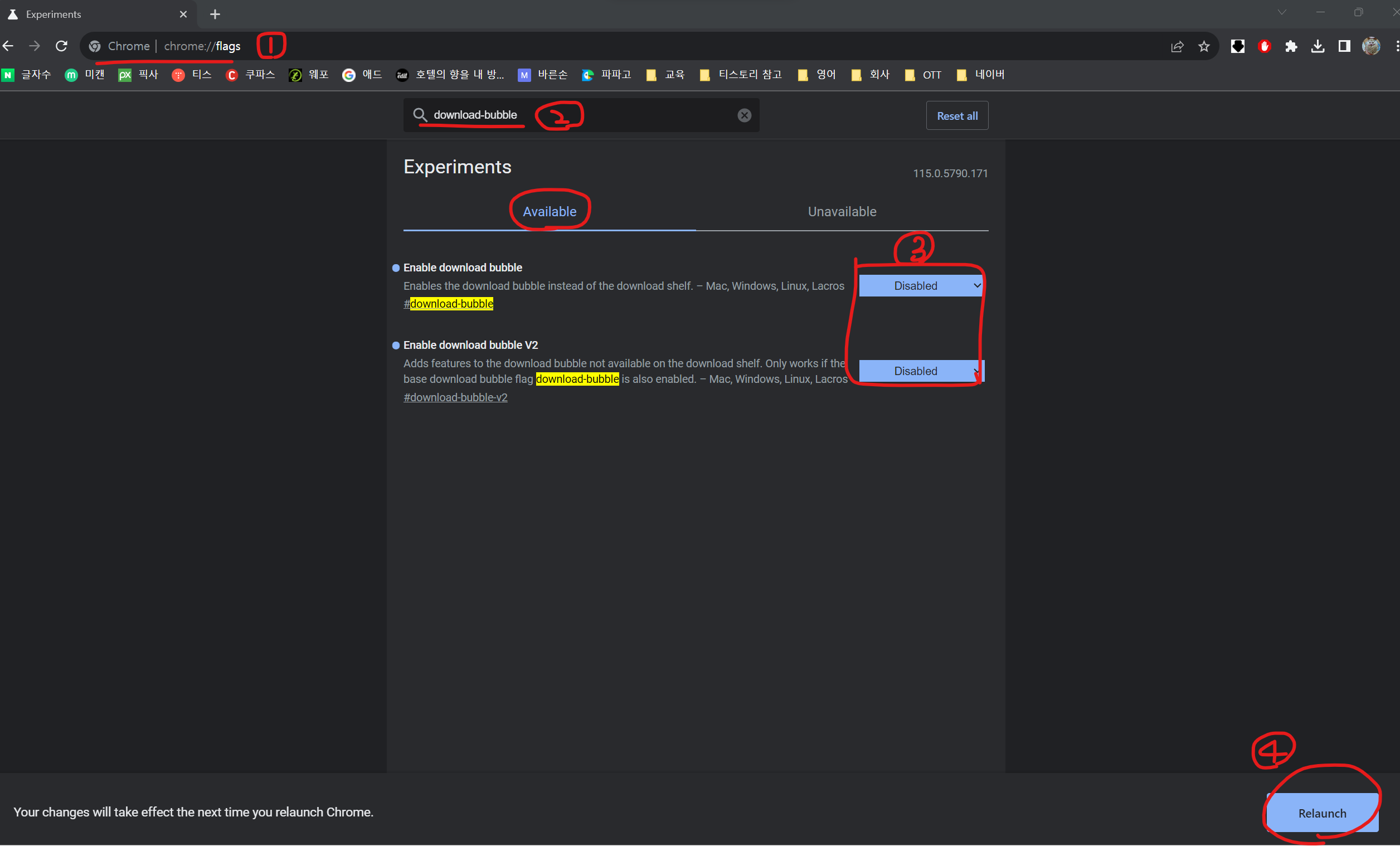 만약, 다운로드 알림창을 아래에서 다시 오른쪽 상단으로 바꾸고 싶다면, Available에서 나오는 항목을 Disabled에서 Enabled로 바꾸고 Relaunch를 눌러주시면 원래대로 돌아가게 됩니다.