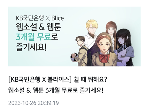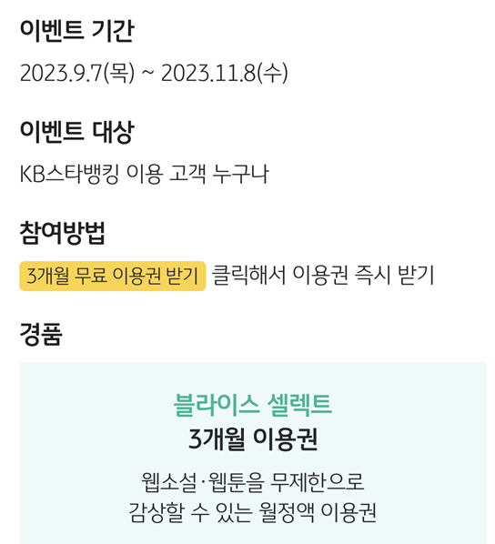 이 이벤트가 좋은 것은 바로 블라이스를 3개월이나 무료로 볼 수 있다는 것입니다. 이벤트 대상은 KT스타뱅킹 이용고객이라면 누구나 가능하고, 이벤트 페이지에서 3개월 무료 이용권 받기를 클릭하면 이용권을 즉시 받을 수 있습니다.