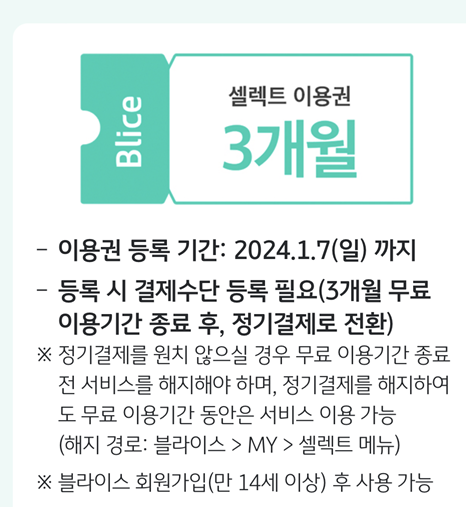 쿠폰을 받았더라도 이용권 등록기간이 2024년 1월 7일이기 때문에 먼저 받아놓고 나중에 쓰시는 것도 가능합니다. (단, 3개월 무료 이용권의 혜택이 끝나는 시점에서는 정기결제로 전환되기 때문에 3개월 전에 해지하시는 것을 잊지마시기 바랍니다.)