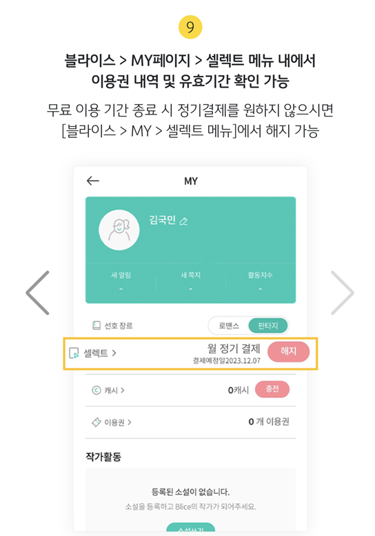 블라이스 셀렉트는 KT가 운영하는 웹소설, 웹툰의 플랫폼인데요. 매월 엄선된 웹소설과 웹툰을 무제한으로 볼 수 있을 뿐만 아니라, 단순히 컨텐츠를 읽는 것을 넘어 웹소설 자체를 연재하는 기회도 얻을 수 있는 곳이라 요새 많은 인기를 누리고 있습니다.