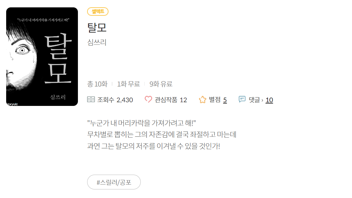 섬뜩하게 누가 내 머리카락을 가지고 가려고 합니다. 무차별로 뽑히는 자존감에 주인공은 좌절을 겪고 맙니다. 과연 주인공은 탈모의 저주를 이겨내고 모근을 지켜낼 수 있을까요? 스릴러 공포 쪽에 가까운 만화입니다.