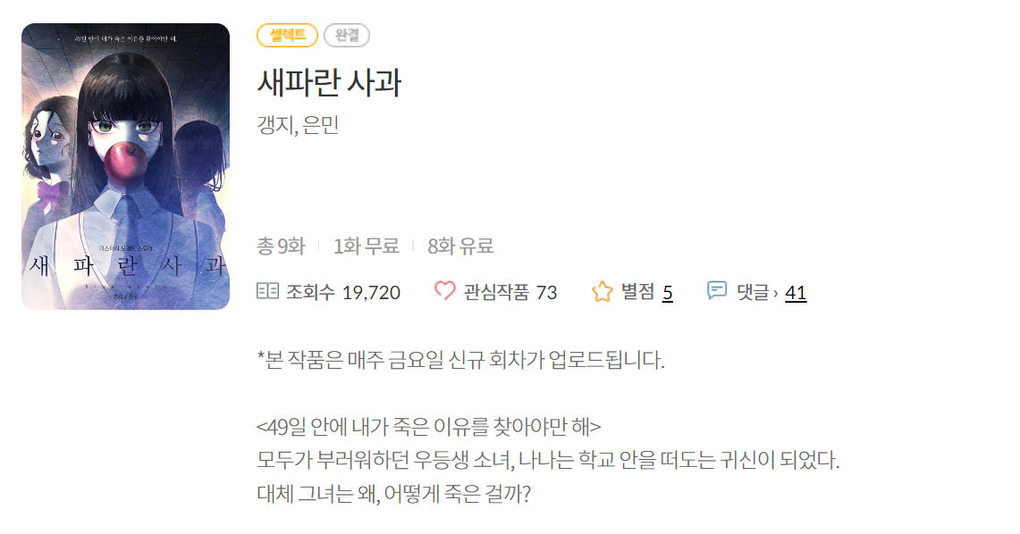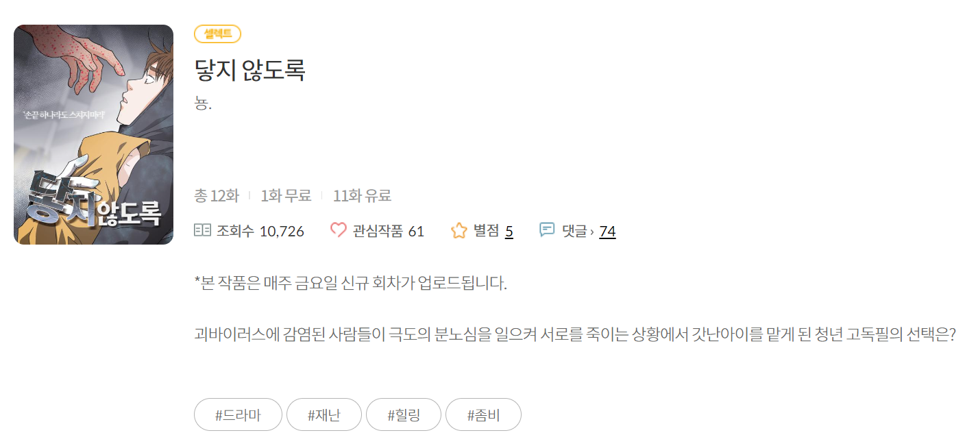 아래 순위는 블라이스 셀렉트 오리지널에서 볼 수 있는 웹툰 10가지를 추린 것입니다. 흥미로운 웹툰이 많으니 간단한 소개 내용을 보시고 관심이 가시는 것들은 한 두 편 무료로 보면서 원하시는 스타일의 만화를 찾으셨으면 합니다.