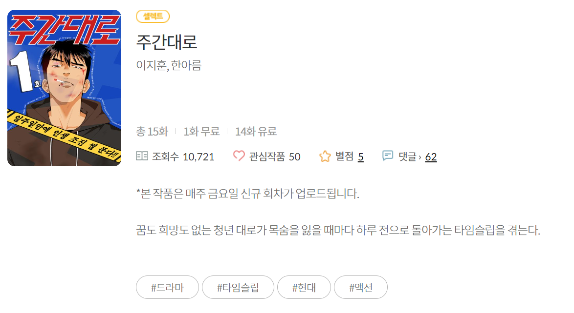 꿈도 희망도 없는 인생 조진 청년, 대로가 목숨을 잃을 때마다 하루 전으로 돌아가는 타임슬립물입니다. 드라마, 현대, 액션, 타임슬립물을 좋아하신다면 짧게 보시면 좋습니다.