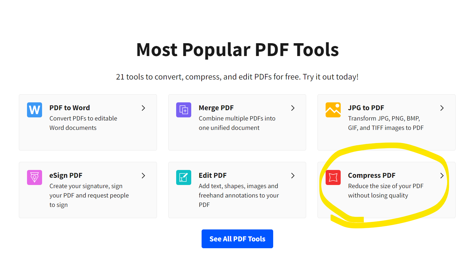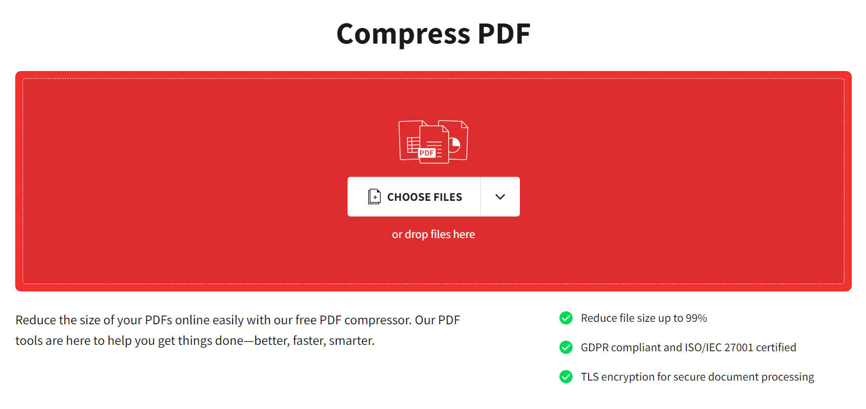 먼저 가장 유명한 Smallpdf입니다. 이 사이트는 PDF 용량 줄이기 기능뿐만 아니라 잠금해제, 파일변환, 파일 합치기 등의 여러 서비스를 무료로 이용 가능하기 때문에 많은 사람들이 쓰는 사이트 중 하나입니다.