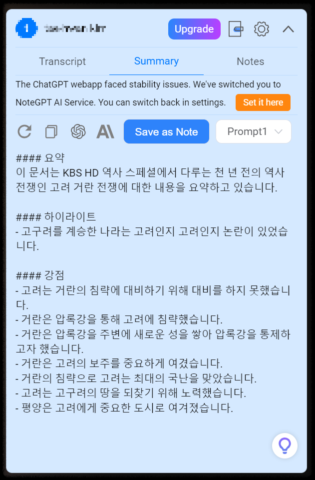 크롬 웹스토어에서 Youtube ChatGPT를 검색하셔서 설치하시면 곧장 사용이 가능합니다. 실제로 사용하는 모습을 보여드리기 위해서 요즘 핫한 드라마 중 하나인 고려 거란 전쟁의 실제 역사에 대한 내용을 프로그램을 이용하여 요약해 보았습니다.