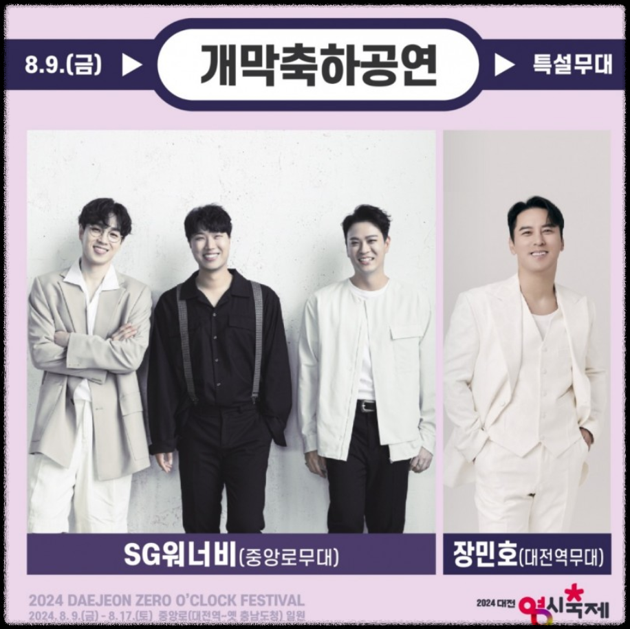 중앙로 무대 (21:00 ~ 24:00)에는 SG워너비, 홍서범&조갑경이 출연하고, 대전역 무대(22:00~23:00)에는 장민호가 출연합니다.
