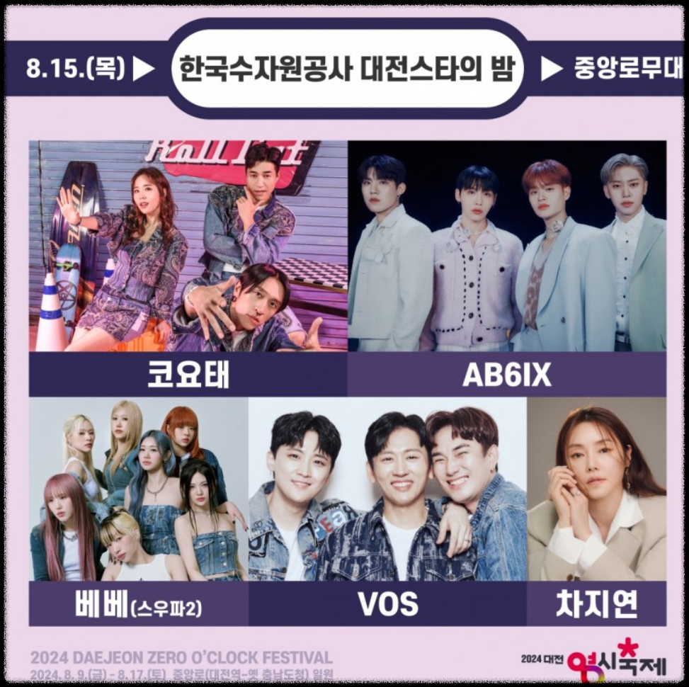 중앙로 무대 (20:00 ~ 24:00)에는 코요테, AB6IX, VOS, 차지연, 김의영, 서경석, 베베(스우파2)가 출연하고, 대전역 무대(23:00~24:00)에는 지원이가 출연합니다.
