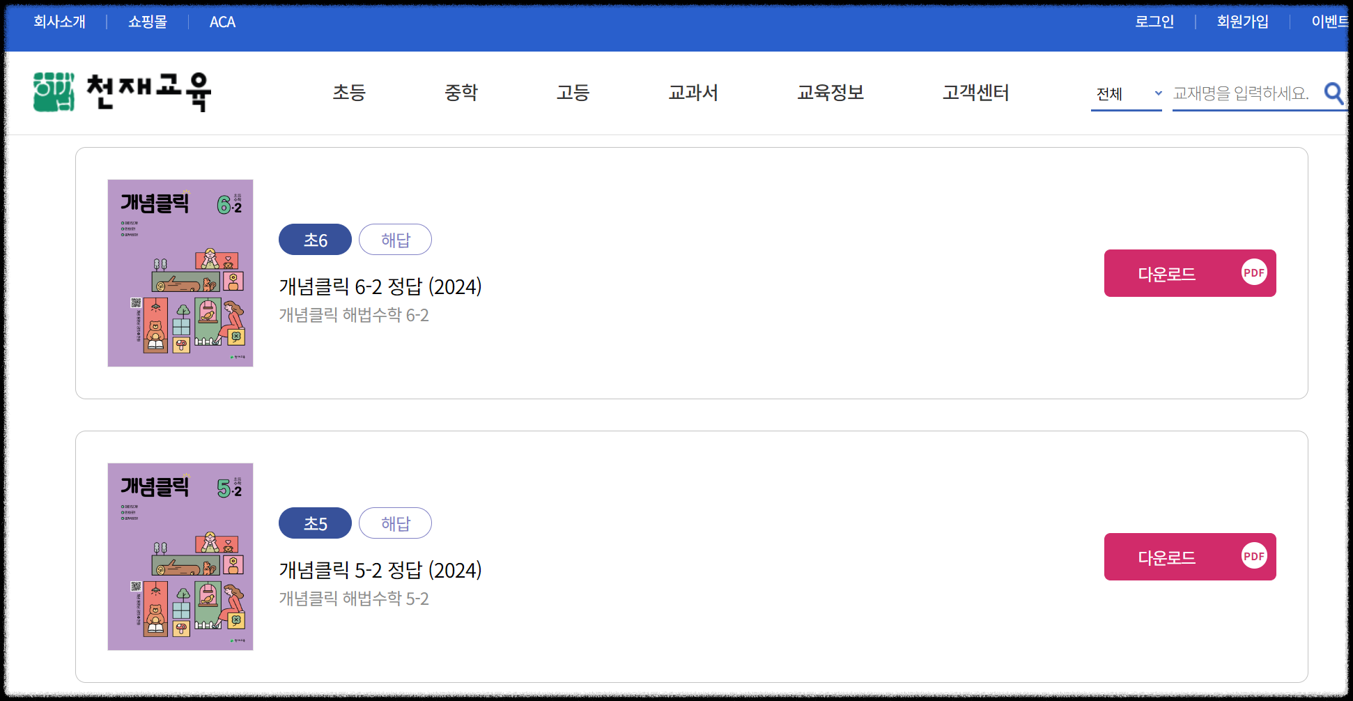 예를 들기 위해 초등교육의 학습지원 - 학습자료실로 들어가 보겠습니다. 개념클릭 5-2 정답 부분을 다운로드 하려고 클릭을 하면 이렇게 로그인하라는 창이 뜨게 됩니다. 따라서, 교과서를 PDF파일 형식으로 다운받기 위해서는 꼭 회원가입을 한 후 로그인을 하셔야 된다는 점 잊지 않으셨으면 합니다.