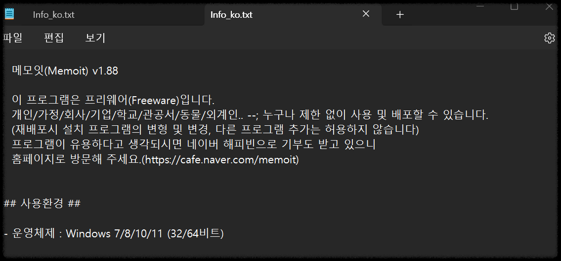 메모잇 프로그램의 공식 웹사이트는 http://mydev.kr/ 입니다. 현재 1.88 버전까지 업데이트된 상태이며, 최종 업데이트 일자는 2024년 8월 17일로 확인됩니다.