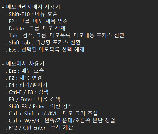 - 메모관리자 열기/닫기 : Ctrl + Alt + End 키로 메모 관리자를 열고 닫을 수 있습니다.