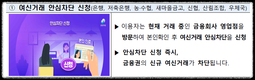 혹시나 필요하실까 싶어 여신거래 안심차단 서비스와 관련하여 금융위원회에서 보도한 관련자료를 아래와 같이 첨부합니다.