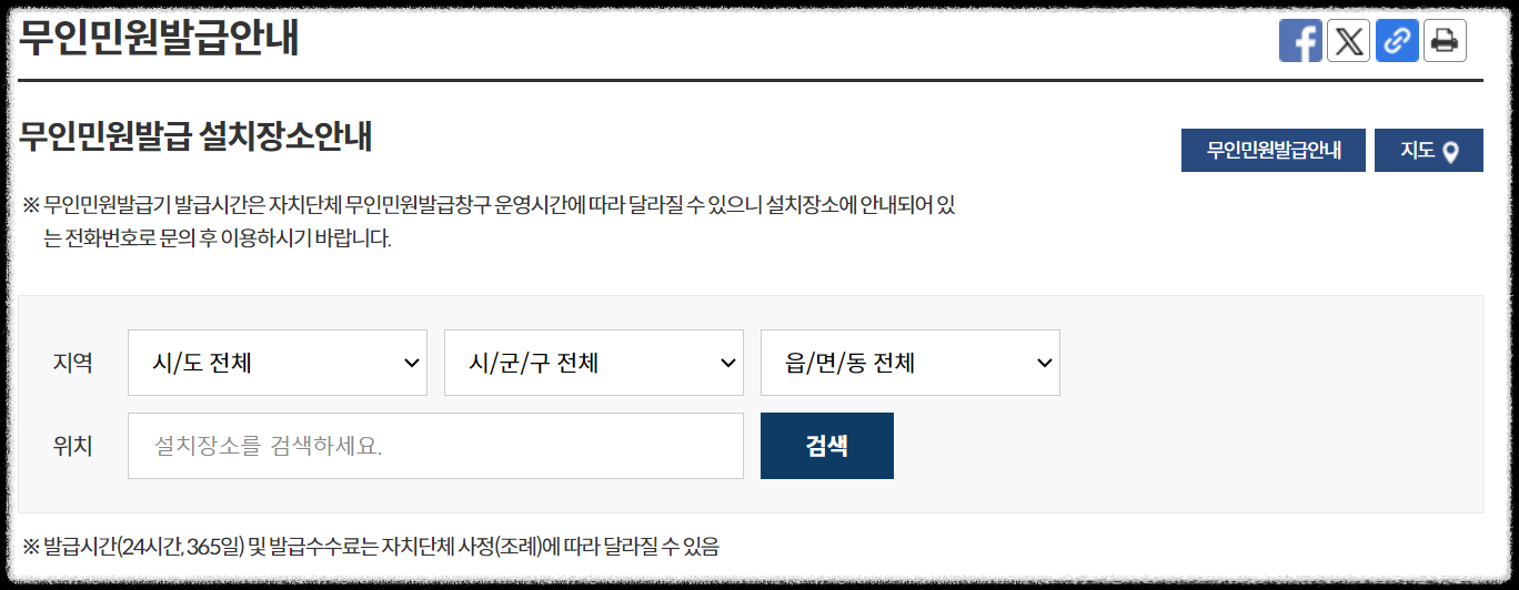이 경우에는 오프라인 발급 방법 중 세무서와 무인발급기를 이용하는 2가지 방법이 있습니다. 세무서의 경우는 근처 세무서를 검색하여 찾아가시면 되지만, 무인발급기는 각 지역마다 설치되어 있는 곳이 정해져 있기 때문에 위치를 확인하고 가시는 것이 좋습니다. 무인발급기의 설치장소는 정부24에서 확인이 가능합니다.