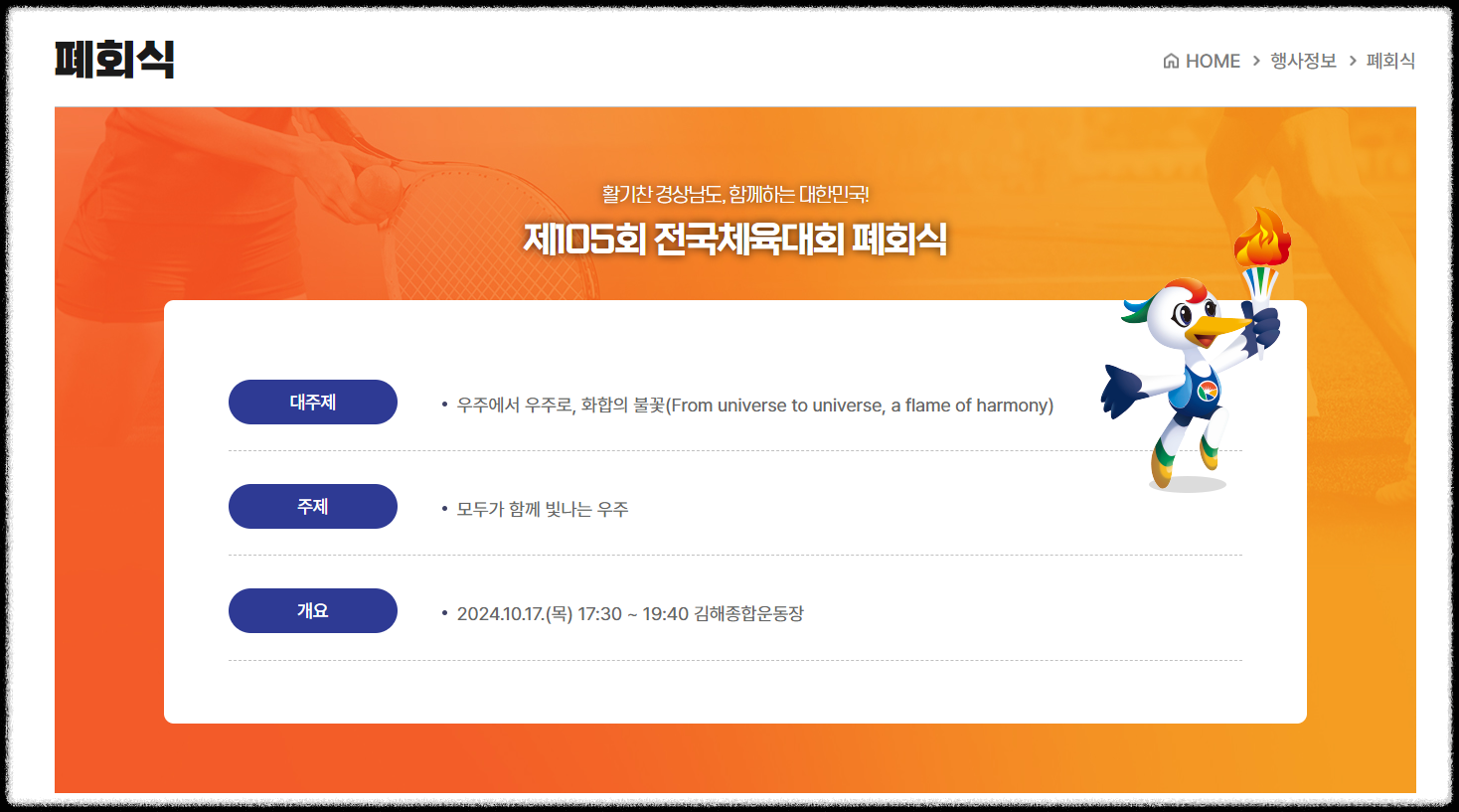 전국체육대회가 끝나고 난 뒤 폐회식은 2024년 10월 17일 (목)에 진행될 예정이며, 개회식과 마찬가지로 김해종합운동장에서 진행되게 됩니다. 자세한 일정은 아래 참고 바랍니다.