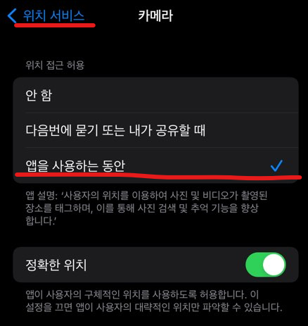 - 위치서비스 - 카메라에서 앱을 사용하는 동안이 체크되었는지 확인한다.