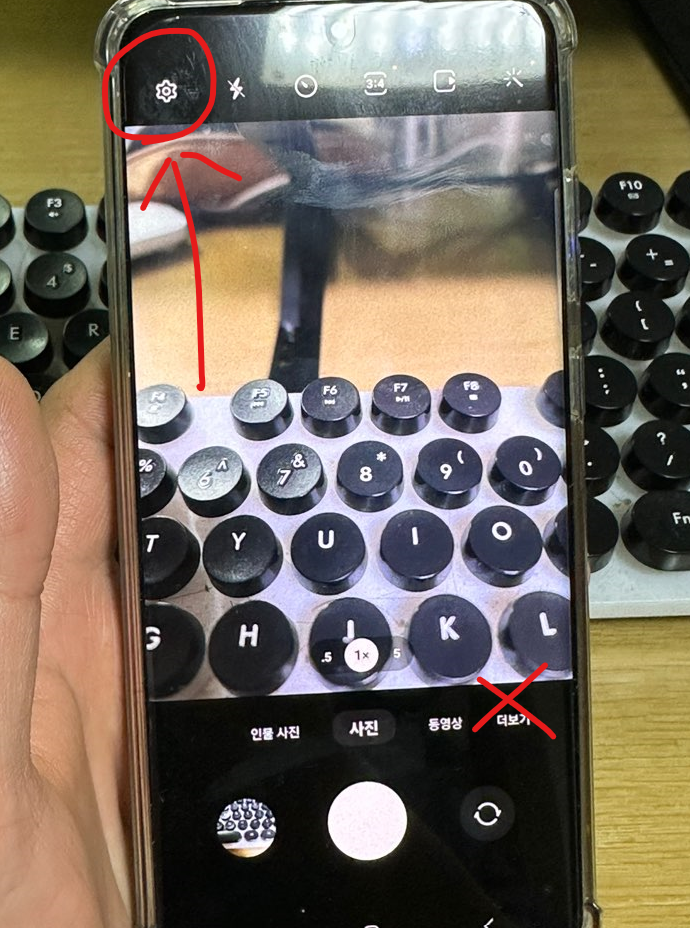 저는 갤럭시 S20 울트라 모델을 기준으로 설정을 했는데, 인터넷에는 카메라 어플에 더보기 (점 세개)메뉴를 누르면 된다고 하는데, 제가 가진 모델은 톱니바퀴를 눌러야 카메라 설정이 나오더라고요. 이 부분 꼭 유의해주세요.