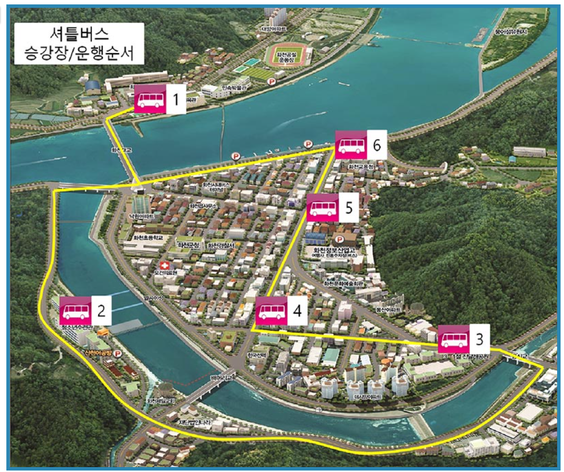 먼저, 외부 셔틀버스의 경우, 축제 기간 중 주말(토, 일)에는 오전 9시부터 오후 6시까지 화천체육관, 청소년수련관, 칠성아파트, 정보산업고 등을 경유하는 무료 셔틀버스가 20분 간격으로 운행됩니다. 버스 3대가 순환 운행 예정이며, 승강장에서 자율 승하차 하시면 됩니다.
