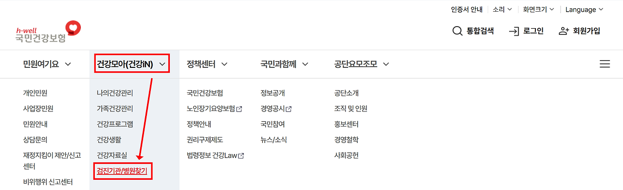 일단, 국민건강보험공단 홈페이지에 접속하여 아래의 메뉴에 따라 검진 대상 병원을 찾으실 수 있습니다.