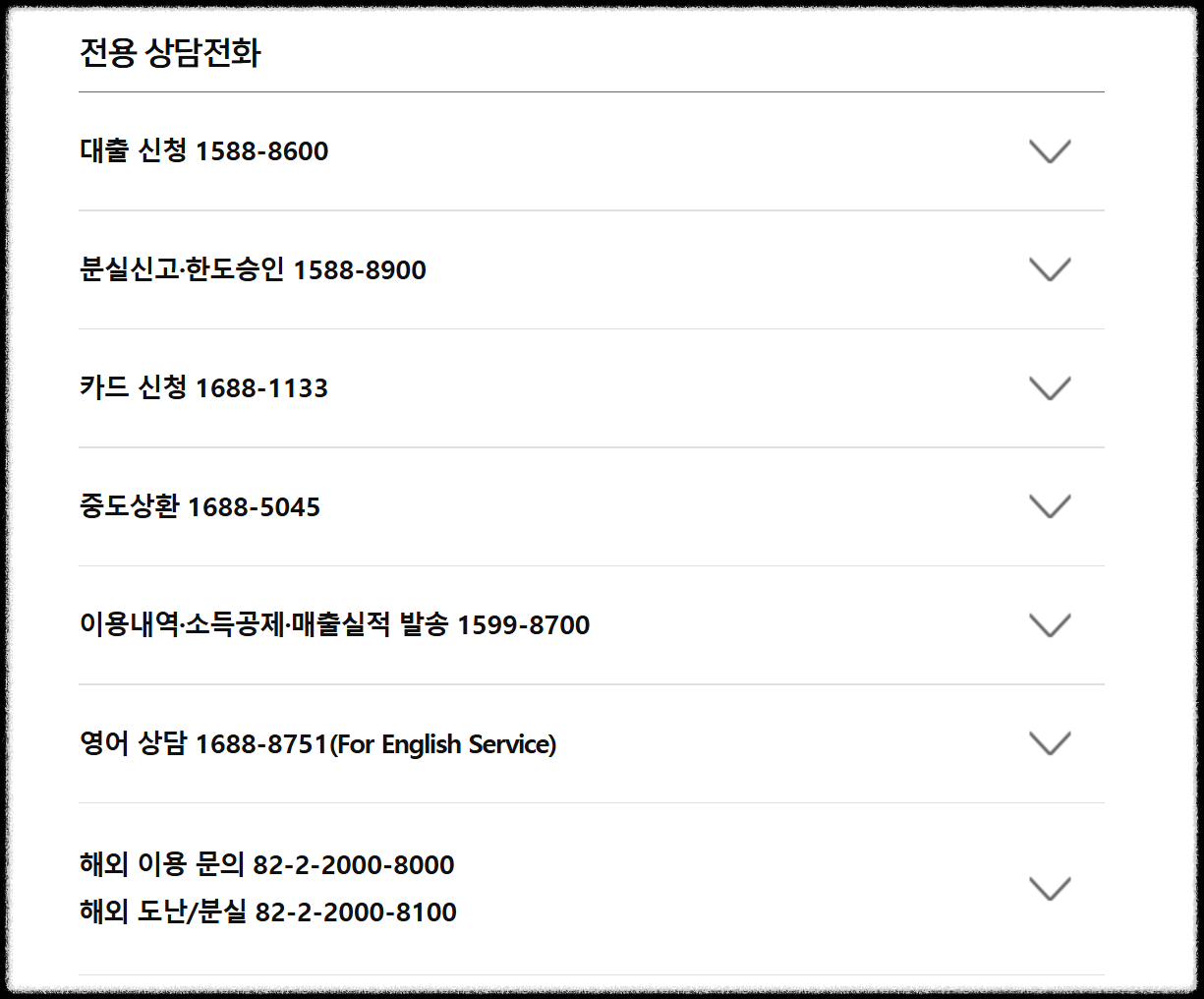 | 해외에서 카드 분실 신고 | +82-2-2000-8100 또는 800-1588-8700 |