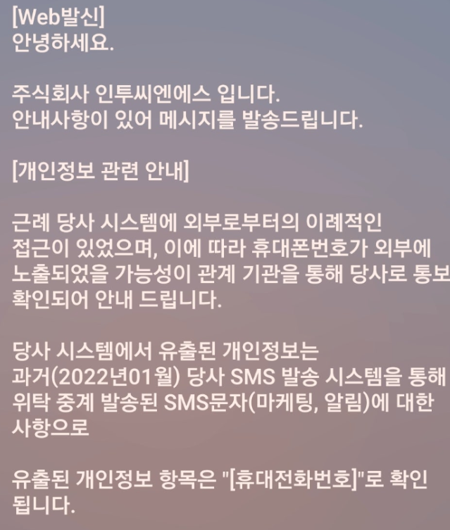 [개인정보 관련 안내] 근례 당사 시스템에 외부로부터의 이례적인 접근이 있었으며, 이에 따라 휴대폰번호가 외부에 노출되었을 가능성이 관계 기관을 통해 당사로 통보, 확인되어 안내드립니다. 당사 시스템에서 유출된 개인정보는 과거(2022년 01월) 당사 SMS 발송 시스템을 통해 위탁 중계 발송된 SMS문자(마케팅, 알림)에 대한 사항으로 유출된 개인정보 항목은 "[휴대전화번호]"로 확인됩니다.