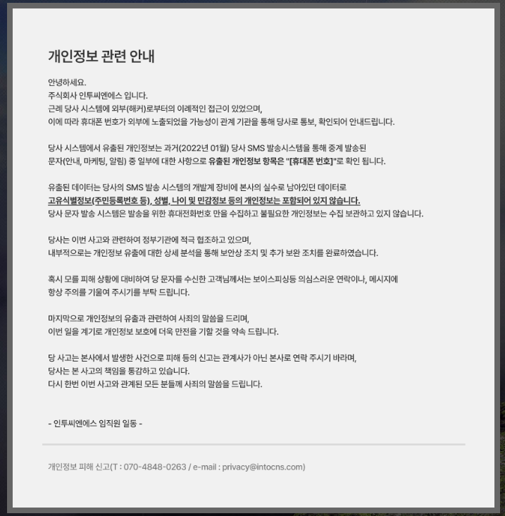 최근 SKT의 대규모 고객정보 유출 사건으로 사회적 관심이 높아진 시점에 이 인투씨엔에스 문자도 함께 도착했습니다. 이건 제 개인적인 생각입니다만… “혹시 법적 문제를 피하려고 지금 시점을 선택해 먼저 공개한 건 아닐까?”