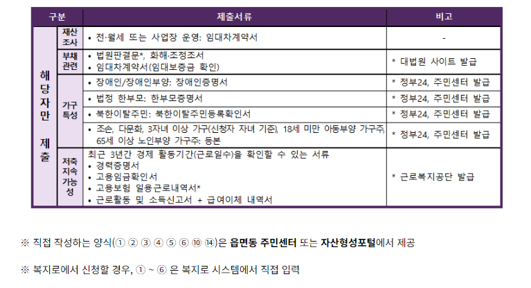 제출서류는 지원 대상 심사를 위한 핵심 자료입니다. 미비 시 보완 없이 탈락될 수 있으므로 반드시 기한 내 준비해야 합니다.