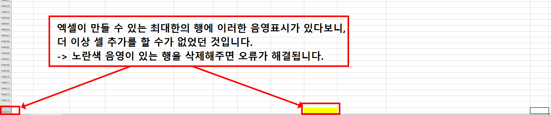 저 같은 경우는 시트의 맨마지막 행에 노란색 음영이 있었습니다. 아마 시트를 정리하다가 은연 중에 들어간 것 같은데, 이 부분을 ( Ctrl + - )로 제거하니 오류가 사라졌습니다.