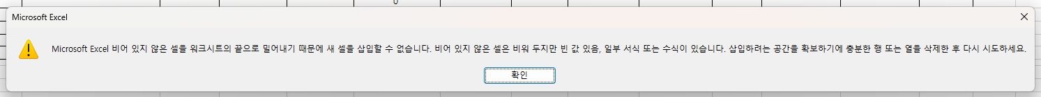 "Microsoft Excel에서 비어있지 않은 셀을 워크시트의 끝으로 밀어내기 때문에 새 셀을 삽입할 수 없습니다. 삽입하려는 공간을 확보하고 다시 시도하세요."