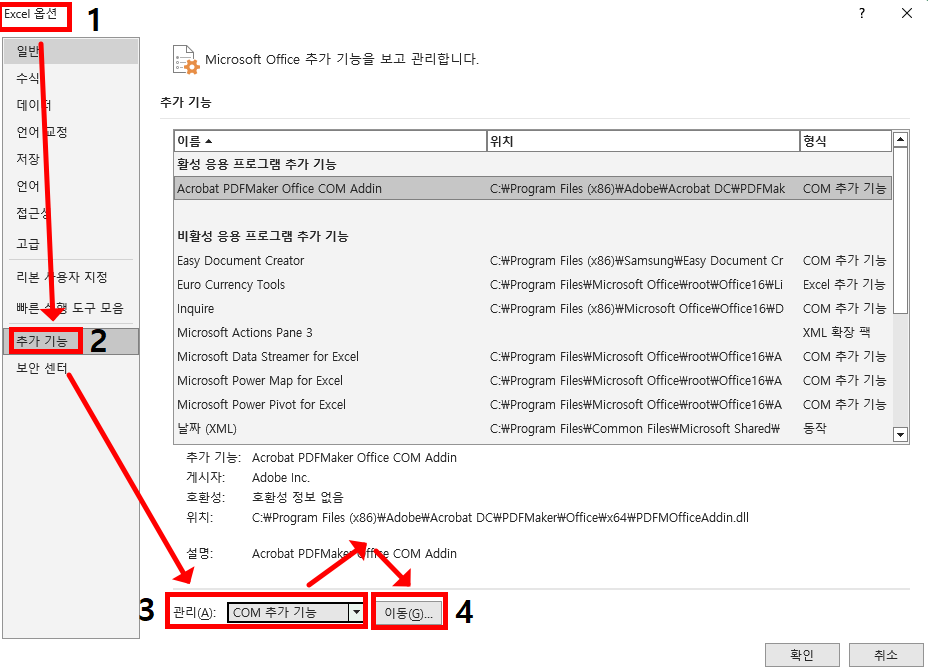 - 파일 → 옵션 → 추가 기능 → COM 추가 기능 → 이동