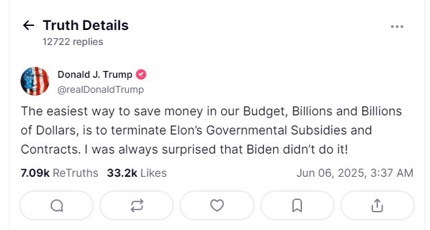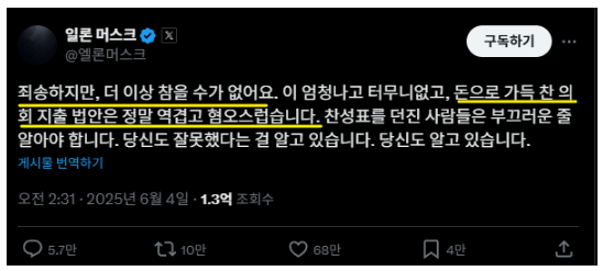 하지만 ‘One Big Beautiful Bill’이라는 대규모 예산 법안을 계기로 균열이 시작됐습니다. 이 법안은 막대한 정부 지출을 포함하고 있었고, 머스크는 이를 “낭비적이고 비효율적인 행정 남용”이라고 평가하며 공개적으로 반기를 들었습니다. 특히 테슬라가 의존해 온 일부 친환경 보조금이 삭감되는 조항이 포함되면서 머스크는 강경하게 돌아섰고, 이로 인해 트럼프와의 관계도 급속히 악화되기 시작했습니다.