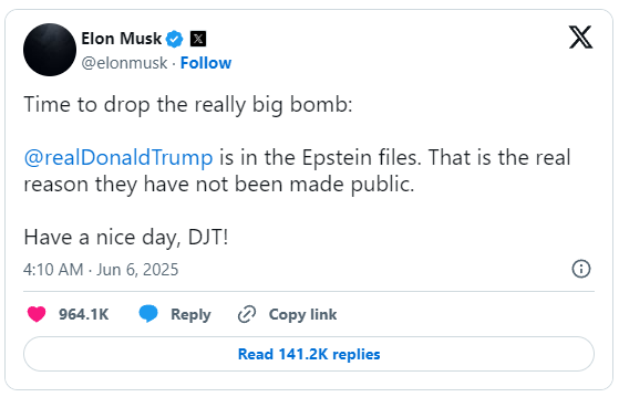 머스크는 자신의 플랫폼 X(구 트위터)를 통해 트럼프에 대한 정면 비판을 쏟아냈습니다. 그는 “이번 예산안은 미국을 뒤로 물러나게 만드는 역겨운 합의”라며 강한 어조로 비난했고, 국민 세금이 사적으로 낭비되고 있다고 주장했습니다. 이어서 그는 트럼프가 제프리 에프스타인 사건과 연관된 인물 중 하나라는 암시를 트윗에 담아 충격을 더했습니다. 해당 주장은 미국 사회에 큰 파장을 불러일으켰고, 이 트윗은 수백만 회 공유되며 논란의 중심에 섰습니다.